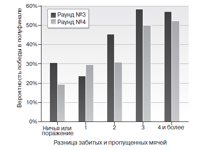 Более того, можно посмотреть, насколько хорошо разница забитых и пропущенных мячей национальной сборной в первом раунде предсказывает, дойдет ли она до полуфинала, как только начались этапы на выбывание. С 1954 года во второй раунд проходит всего 180 национальных сборных, при этом средний отрыв, дающий шансы на победу, составляет всего лишь менее одного гола за матч. Используя статистическую методику, соотносящую эффективность и вероятность, мы определили, что б?льшие шансы на победу в первом раунде значательно связаны с б?льшими шансами на победу в полуфинале. На самом деле, дополнительный гол в каждом матче группового этапа повышает среднюю вероятность того, что национальная сборная пройдет в полуфинал, с 25 до 40 процентов.