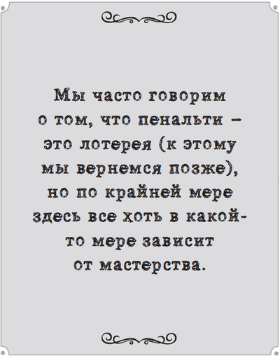 Нет ни одной составляющей футбола, которую было бы легче проанализировать, чем пенальти. Помимо всего прочего, даже самый страстный противник аналитики не будет полностью уверен в своей правоте, предполагая, что серия пенальти «слишком изменчива», чтобы стать предметом того вида анализа, который столь успешно применялся в бейсболе. Ситуация в точности такая же: как и бейсбольный бросок, пенальти заключается в конфронтации между двумя игроками, каждый из которых должен выполнить всего одно действие. Питчер бросает, пенальтист бьет по мячу, бэттер отбивает (иногда), а голкипер ловит. Пенальти должны быть просты для рассмотрения. Неудивительно, что они оказались привлекательны для различных исследователей, желающих установить, что делает пенальти (или отражение пенальти) успешным.
