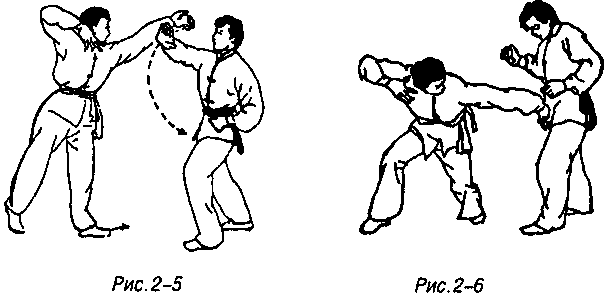 Из позиции для атаки швыряемой ладонью правая нога толкает землю, левая нога продвигается вперед, одновременно левая лад>нь с тыльной стороной в качестве точки приложения силы наносит швыряемый удар вперед в лицо или по глазам, ноги распрямляются, правая нога стоит на передней части подошвы, вес тела смещается на левую ногу, корпус чуть наклоняется вперед (рис. 2-5).