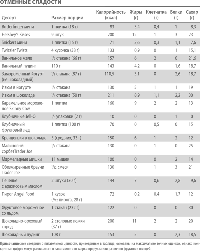 Некоторые из женщин, принимавших участие в моем исследовании, говорили мне, что смогли успешно изменить свою привычку к поеданию сладостей, оставив их исключительно на десерт (отказавшись от сладких полдников или завтраков). Другие рассказывали, что для них самым удобным вариантом оказался переход на «диетические десерты» (например, марки SkinnyCow). Они продолжают есть сладкое каждый или почти каждый день, но перешли на более полезные альтернативы. В таблице ниже приведены некоторые из полезных сладостей, которыми вы можете попробовать заменить привычные лакомства.