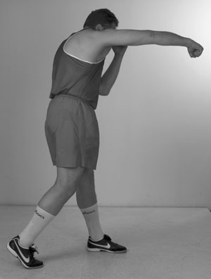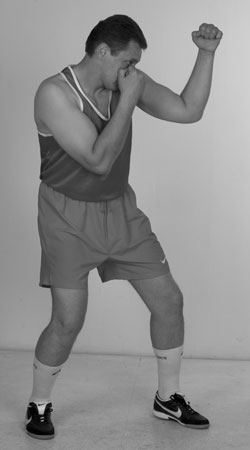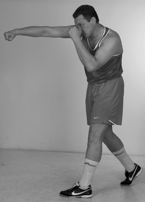 Поднимаясь вверх и поворачивая заднюю часть тела, проталкиваем локтем кулак задней руки вперед в область головы противника. Голова подбородком на груди. Локоть поднят и закрывает голову. Переднюю руку можно отводить к своему подбородку, но лучше научиться удерживать ее немного впереди. Фото 45, 46.