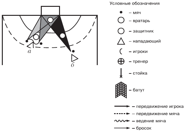 В первой ситуации (а) нападающий, укрывшись от вратаря за защитником, не маскирует своих намерений от защитника. Наоборот, он старается показать, что производит бросок, разбегаясь прямо на защитника, и вызвать того на ответные действия – блокирование. Применив бросок с наклоном туловища, игрок посылает мяч в ворота.
