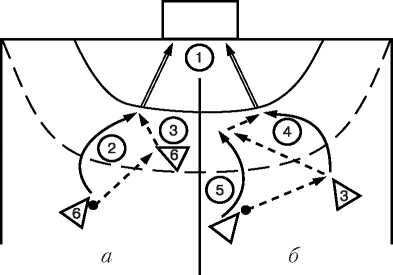 Рис. 53. Внешний заслон без ухода: а – начинает игрок без мяча, б – начинает игрок с мячом