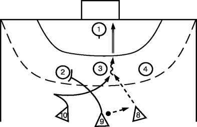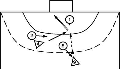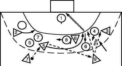 На рис. 51 показано взаимодействие трех игроков с передачей при встрече. Это взаимодействие можно продолжить, если чистый выход на бросок не получился, подключив еще нападающих. В гандболе такое продолжение называют «восьмеркой».