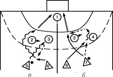 Внешнее скрестное взаимодействие могут выполнять два, три игрока. Игрок, начинающий взаимодействие, движется в сторону партнера. Этим он наводит защитников друг на друга, создает коридор для завершения атаки партнеру, который, перемещаясь, пересекает путь его движения. Как показано на рис. 50, а, взаимодействие начинает игрок 5 с мячом, применив ведение. Передача мяча происходит в момент встречи партнеров на линии атаки второго. На рис. 50, б взаимодействие начинает нападающий 6 без мяча. Он движется в сторону партнера, получает мяч и переводит его в ведение. Игрок 7 делает рывок и выходит на свободную позицию. Передача мяча следует ему по ходу движения.