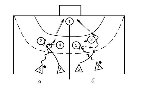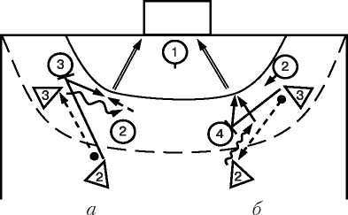 Рис. 50. Внешнее скрестное взаимодействие двух игроков: а – начинает игрок с мячом, б – начинает игрок без мяча