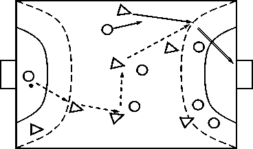 Прорыв осуществляется с двух позиций: от вратарской зоны (от ворот) и с центра площадки при начальном броске. Прорыв выполняют один или несколько опекаемых нападающих, которые обыгрывают защитников, передавая мяч друг другу или применяя ведение мяча. Нападающие вместе с опекунами перемещаются к воротам противника, а следом движутся партнеры, свободные от опеки, которые могут завершить атаку (рис. 60).