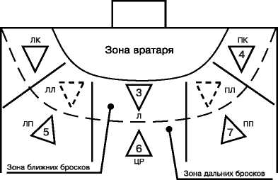 Рис. 61. Расстановка игроков по амплуа: ЛК – левый крайний, ПК – правый крайний, ПП – правый полусредний, ЛП – левый полусредний, Л – линейный, ПЛ – правый линейный, ЛЛ – левый линейный, ЦР – центральный разыгрывающий