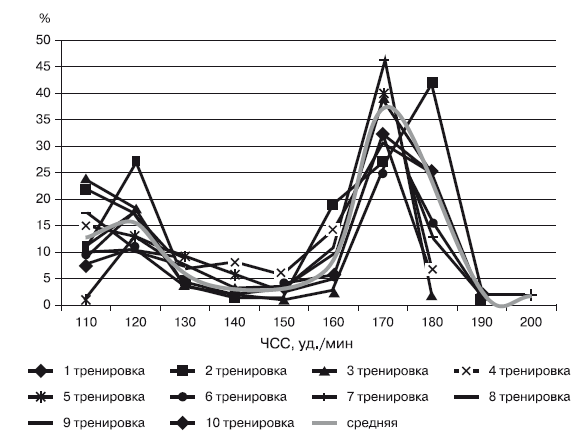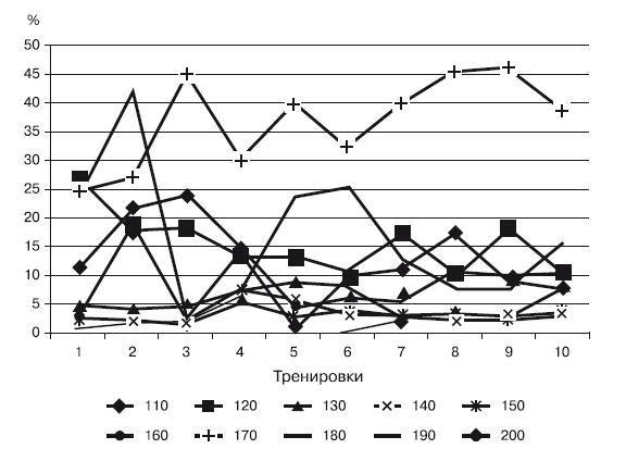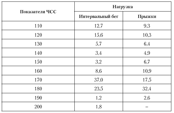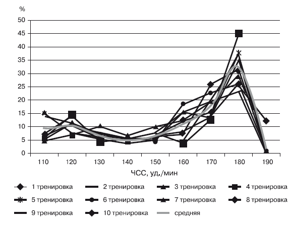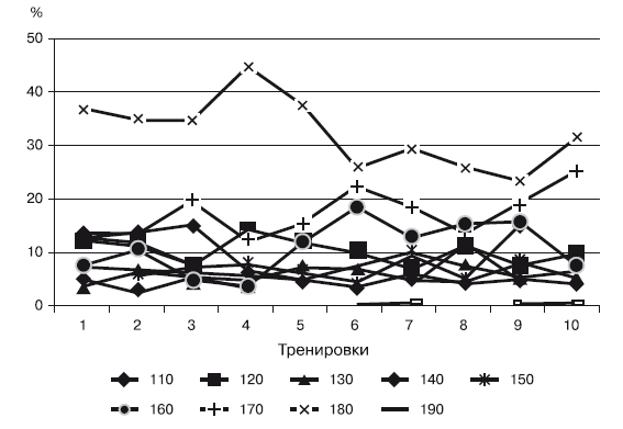 Во время тренировочной работы ЧСС в 110–120 уд./мин и до 160 уд./мин составила примерно 10–11 % времени; от 130 до 150 уд./мин – примерно от 5 до 7 %. Начиная со 170 уд./мин процент выполненной работы повышается до 17,5 %, а при 180 – до 32,4 % и, наконец, при ЧСС 190 уд./мин нагрузка резко падает до 2,6 %.