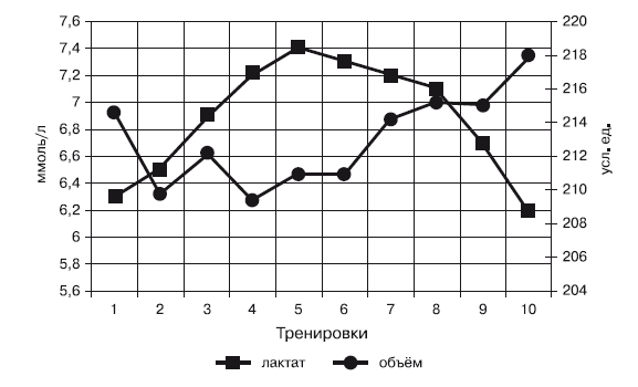 Такие изменения говорят о том, что организм в ходе выполнения предложенной нагрузки вырабатывал адаптационные механизмы на протяжении девяти тренировок в аэробно-анаэробном режиме и к десятому занятию был готов к переходу на более высокой уровень нагрузки, где большее значение приобретают гликолитические механизмы энергообеспечения, и нагрузка будет носить анаэробно-аэробную направленность.