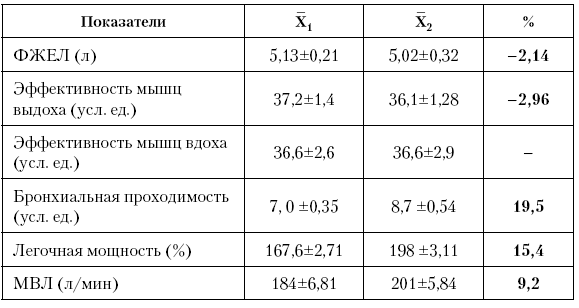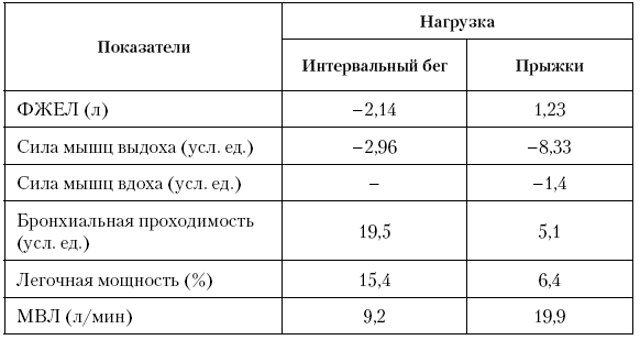 После применения прыжковой нагрузки незначительно улучшились показатели форсированной жизненной емкости легких, бронхиальной проходимости и легочной мощности (от 1,2 до 6,4 %), эффективность мышц вдоха и выдоха уменьшилась на 1,4 и 8,33 % соответственно, значительно возросла максимальная вентиляция легких – на 19,9 %.