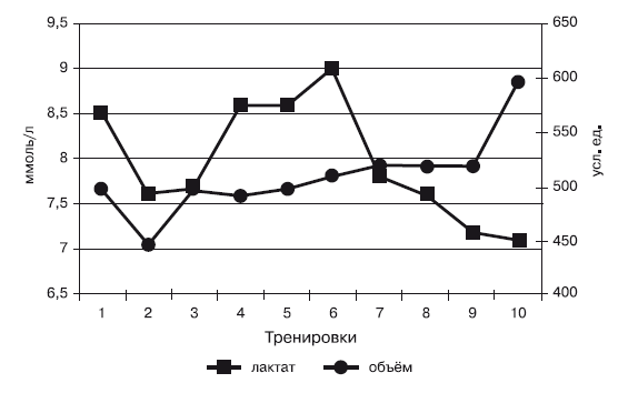 На рис. 17 видно, как изменялся объем выполненной работы и увеличивалась концентрация лактата в крови дзюдоистов. Так, на второй тренировке лактат понизился на 0,9 ммоль/л, что можно объяснить привыканием организма к новым условиям тренировки, т. к. на этом же рубеже уменьшился объем выполненной работы. Начиная с третьей тренировки, концентрация лактата в крови резко, а объем выполненной работы постепенно увеличиваются до шестой тренировки, где концентрация лактата сначала резко, а затем постепенно начинает снижаться. И даже при резком увеличении объема выполненной работы на десятой тренировке концентрация лактата незначительно снижается. Таким образом, можно констатировать, что порог аэробно-анаэробной работоспособности дзюдоистов увеличился.
