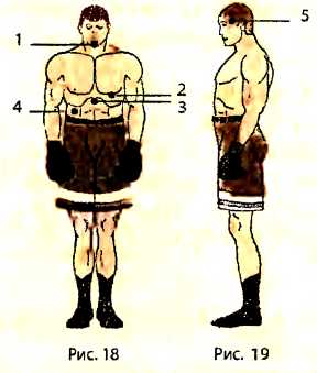 Наиболее уязвимые места на теле боксера указаны на рис. 18 (вид прямо) и рис. 19 (вид справа).