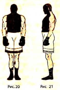 В ходе ведения боя боксеру разрешается наносить удары только в переднюю часть головы и туловища. На рис. 20 (вид прямо) и рис. 21 (вид слева) эти части тела боксера заштрихованы.