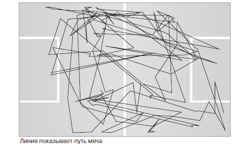 Мы можем увидеть, как тяжело командам самых популярных в мире футбольных лиг владеть мячом, прослеживая маршруты передвижения мяча во время обычного матча при помощи данных Opta. Мы взяли произвольно выбранный десятиминутный период в произвольно выбранном матче Премьер-лиги (матч между «Астон Вилла» и «Вулвсом» 19 марта 2011 года), чтобы продемонстрировать это вам (диаграмма 26). Мяч скакал по полю, этот бессистемный узор больше напоминает картину Джексона Поллока, чем серии запланированных перемещений мяча.