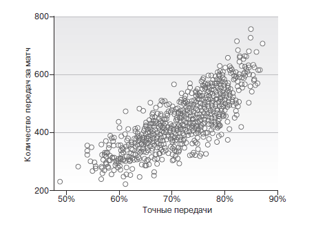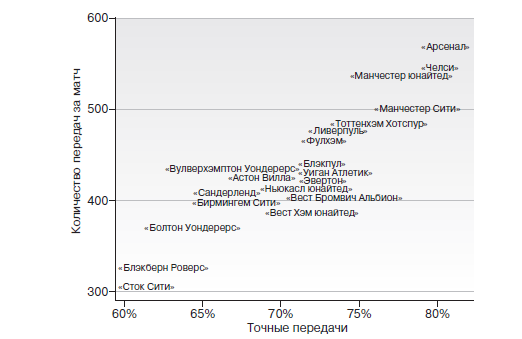 Но реальные данные показывают, что владение мячом обычно бывает более прозаичным. Как видно на диаграмме 27, мастерство в передаче мяча и количество передач в Высшей лиге обычно идут в тандеме. Команды, пасующие чаще, обычно завершают больший процент передач, а команды, завершающие больший процент передач, чаще получают шанс пасовать. Если рассматривать числовые данные 380 матчей Премьер-лиги (весь сезон-2010/11), то тактика и мастерство во владении мячом согласуются. Повысить шансы того, что пасы, разыгранные командой, будут переданы нужному игроку, означает большее количество владений мячом в течение как матча, так и сезона.