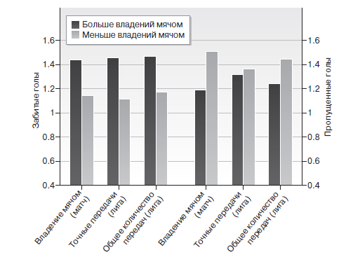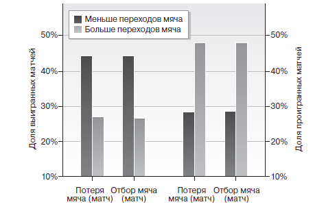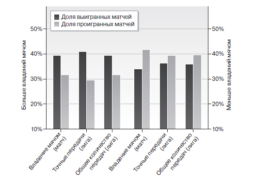 Да не важно, какие или когда матчи мы рассматривали. Стоит заметить, что и успешные, и неуспешные команды дольше владели мячом, когда проигрывали в матчах, чем когда выигрывали. Команды, которые были впереди, отдавали мяч чаще, а те, что пропустили гол или два, пытались отыграться и потому видели мяч чаще. Настоящее различие между победой и поражением заключалось в том, что успешные команды сохраняли владение мячом значительно дольше, чем неуспешные, каким бы ни был счет в этот момент.