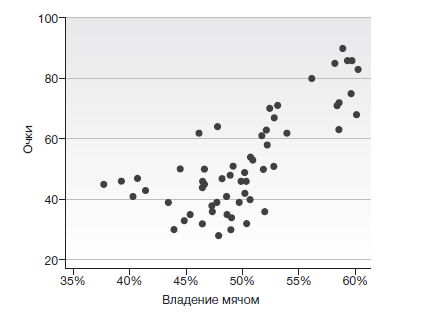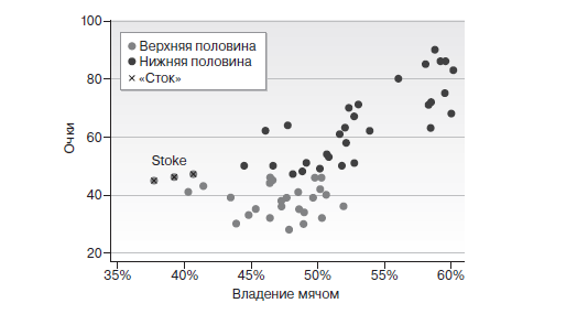 Все это приводит к результату в конце сезона. Команды, больше владевшие мячом, доминируют в верхних строчках таблицы лиги, а те, что не добились этого, будут, скорее всего, бороться с переводом в низшую лигу. Чтобы увидеть, насколько это явно выражено, мы графически изобразили количество очков, набранных клубами за сезон, и среднее количество владений мячом, которое было у них в сыгранных ими матчах (диаграмма 33; каждый кружок представляет эффективность клуба за год)21.