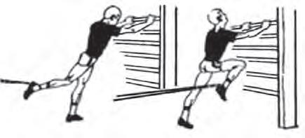 При броске в прыжке маховое движение одной ноги способствует отталкивающему движению другой. При силовой подготовке целесообразно выполнять имитацию этого движения (рис. 88).