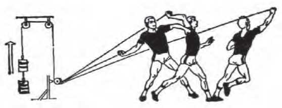 Для увеличения силы мышц, участвующих в выполнении основной фазы броска в опорном положении, можно применять упражнения со стимулирующим ударным растягиванием их перед активным сокращением с помощью блочных тренажеров (рис. 89).