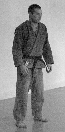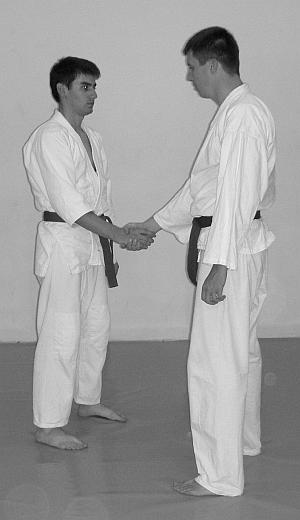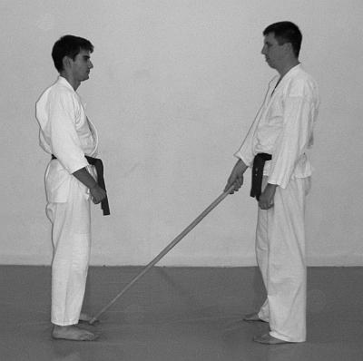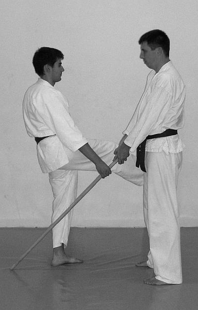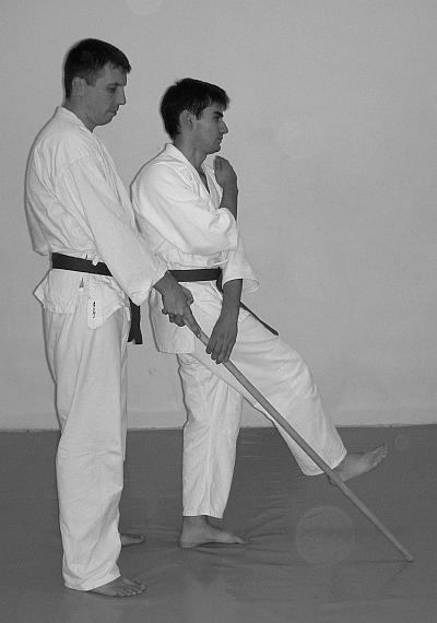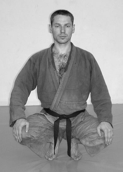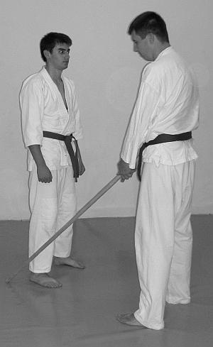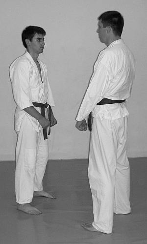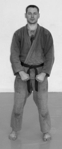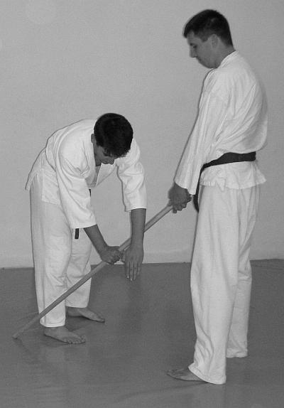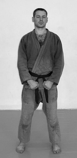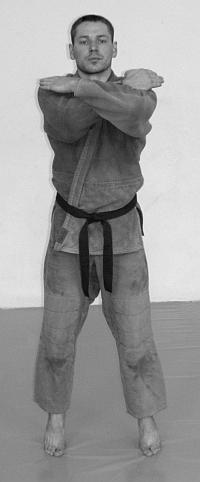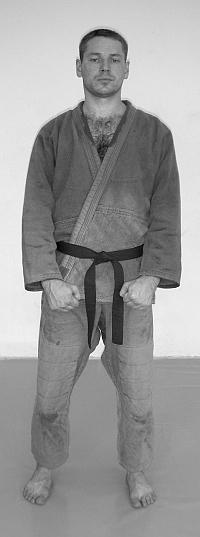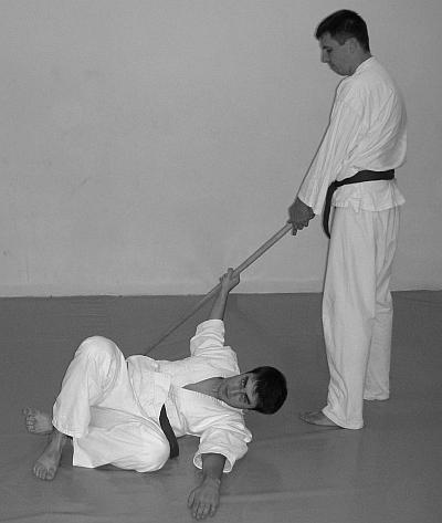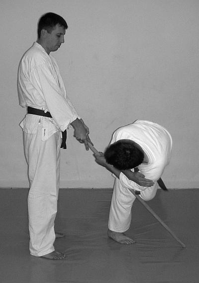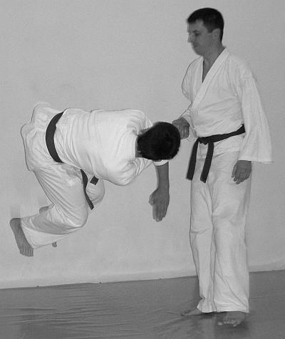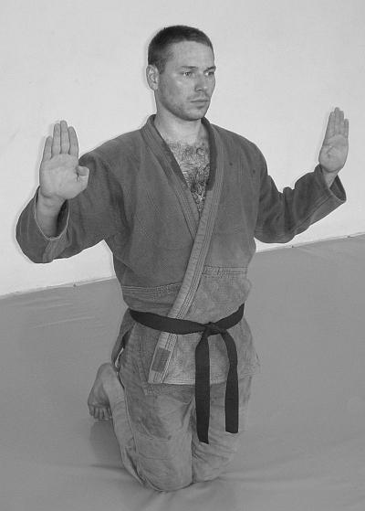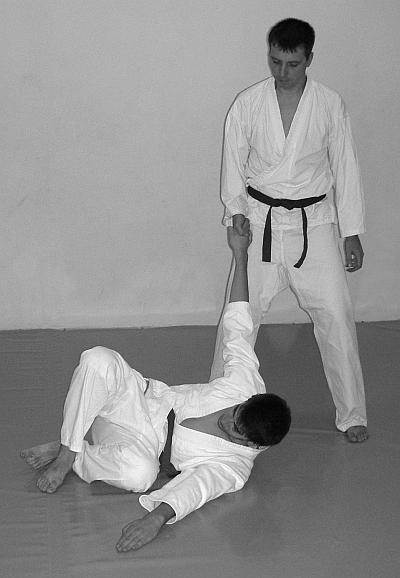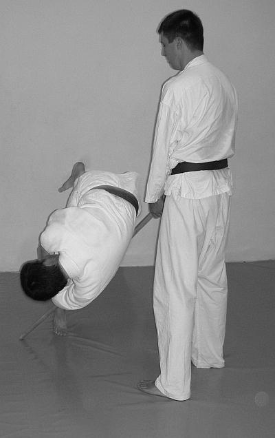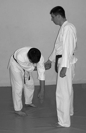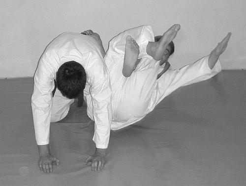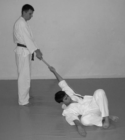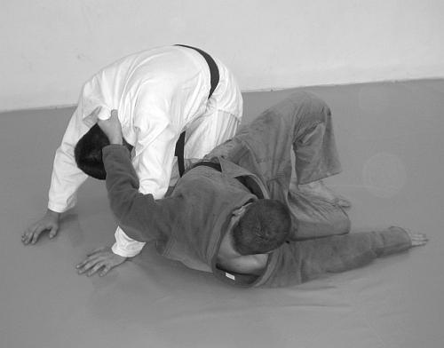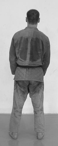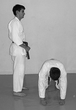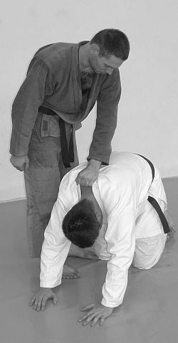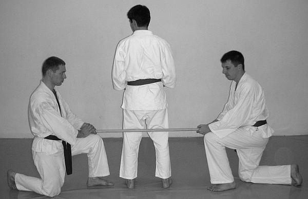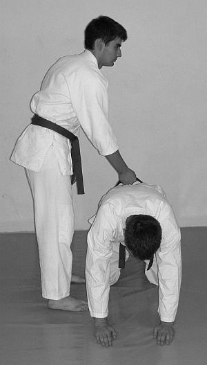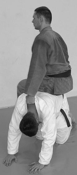 1. Исходное положение: помогающий располагается на четвереньках. Голова опущена. Отрабатывающий технику становится сбоку, лицом к нему. Левая рука захватывает отворот кимоно сзади – фото 29—30.