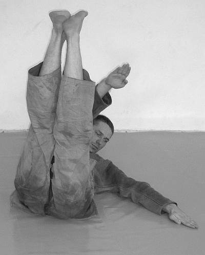 2. Упасть набок, одновременно выполнив амортизационный хлопок одноименной рукой. Другая рука вытянута вперед вверх. Ноги вместе. Прямые. Вертикально подняты вверх. Угол в 90 градусов между ногами и корпусом сохраняется неизменным. Подбородок прижат к груди. Спина слегка согнута – фото 4.