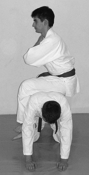 1. Исходное положение: помогающий располагается на четвереньках. Голова опущена. Отрабатывающий технику подходит к нему сбоку и садится на спину помогающему – фото 25—26.