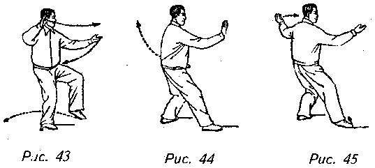 мимо левого бедра, а затем вверх до уровня плеч, держа ладонь кверху. В это же время левой ногой сделайте шаг назад, перенесите на нее центр тяжести; после чего поверните правую ладонь кверху и посмотрите на нее (рис. 43, 44, 45).