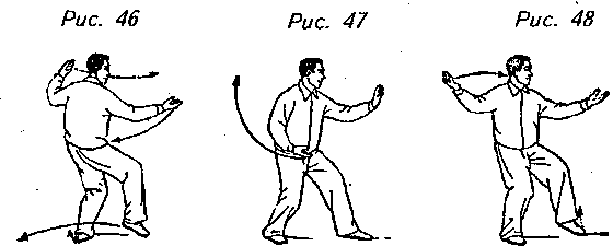 Движение 3: Согните левый локоть и вытолкните левую ладонь вперед мимо своего левого глаза прямо с ладонью отвернутой от вас. Пока левая рука движется вперед, правую нужно перенести вниз и назад по кривой мимо правого бедра, а затем вверх до уровня плеч, держа ладонь кверху. В это же время правой ногой сделайте шаг назад, перенесите на нее центр тяжести; после чего поверните левую ладонь кверху и посмотрите на нее (рис. 46, 47, 48).