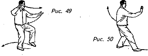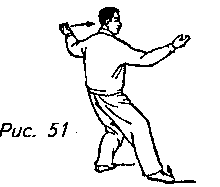 Движение 4: Согните правый локоть и вытолкните правую руку мимо правого глаза прямо вперед с ладонью, отвернутой от вас. Пока правая рука движется вперед, левую нужно перенести вниз и назад по кривой мимо левого бедра, а затем вверх до уровня плеч, держа ладонь кверху. В это же время левой ногой сделайте шаг назад, перенесите на нее центр тяжести; после чего поверните правую ладонь кверху и посмотрите на нее (рис. 49, 50, 51).