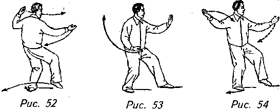 Движение 5: Согните левый локоть и вытолкните левую ладонь вперед мимо своего левого глаза прямо с ладонью, отвернутой от вас. Пока левая рука движется вперед, правую нужно перенести вниз и назад по кривой мимо правого бедра, а затем вверх до уровня плеч, держа ладонь кверху. В это же время правой ногой сделайте шаг назад, перенесите на нее центр тяжести;после чего поверните левую ладонь кверху и посмотрите на нее (рис. 52, 53, 54).