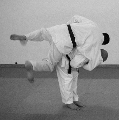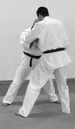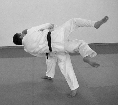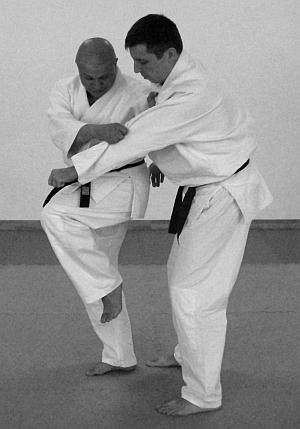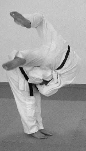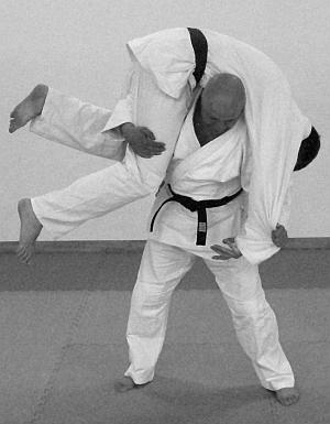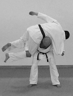Начало выполнения приема предполагает обозначение выполнения отвлекающих действий или нанесение отвлекающего удара (фото 2).После выполнения самого броска в обязательном порядке обозначается завершающий удар ногой (фото 5—6).