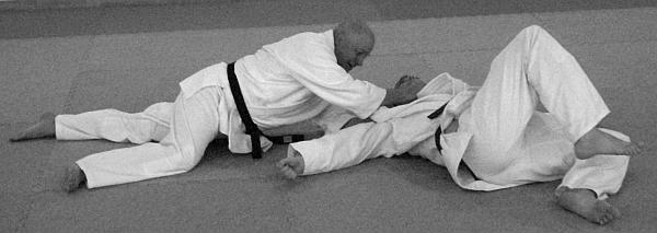 В этом варианте выполнения приема и техники броска представлено выполнение техники болевого приема на руку (рычаг локтя через бедро) – фото 63.