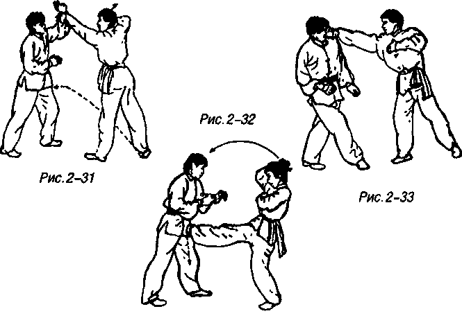 Из позиции для разведки дороги рубящей ладонью правая нога толкает землю, левая нога продвигается вперед, одновременно левая ладонь через верх наносит вперед-вниз рубящий удар по голове или шее противника (рис. 2-31).
