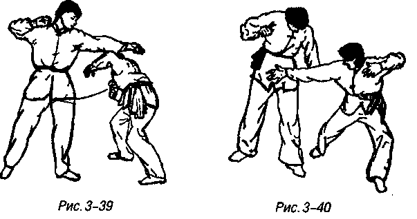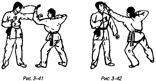 Из позиции для разведки дороги рубящей ладонью, когда противник с левой ногой впереди левым кулаком наносит прямой удар мне в лицо, я чуть поворачиваю корпус вправо, предплечье левой руки с краем локтевой кости в качестве точки приложения силы поворачиваю вокруг своей оси наружу, ставя вправо подвесную преграду руке противника (рис. 3-41).