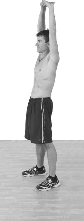 1. Встаньте прямо, ноги на ширине плеч, вытяните выключенные в локтях руки над головой, переплетите пальцы и поверните ладони вверх. Руки должны оставаться выпрямленными в ходе всего упражнения.