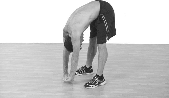 2–3. Наклоняясь от бедер, опускайте кисти рук в направлении правой ноги, а затем, продолжая круговое движение, подведите их к пальцам правой ноги, затем к левой ноге, а потом верните их в исходное положение над головой с максимальным прогибом назад.