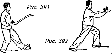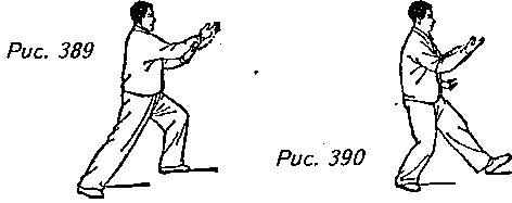 Движение 1 (продолжает рис. 388): Вытяните левую руку под правым запястьем ладонью вверх, распрямите правую ладонь, направив ее поверхность тоже вверх, а затем медленно разведите руки по закругленной траектории в разные стороны на уровне груди. Одновременно с этим согните правое колено, отклонитесь немного назад, слегка приподнимая носок левой ноги и перенося тяжесть своего тела на правую ногу. Взгляд обращен прямо вперед (рис. 389, 390).