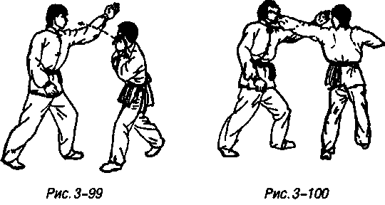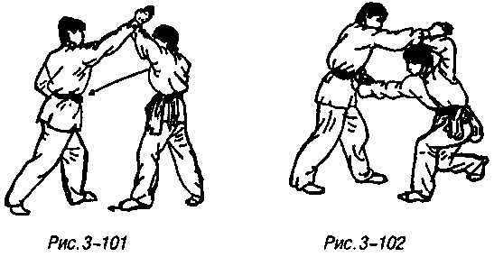 Левая нога следуя ситуации продвигается на полшага влево-вперед, ноги сгибаются в коленях приседая (правое колено идет к земле), корпус поворачивается влево, одновременно правая ладонь с пальцами направленными вверх и центром ладони обращенным вперед наносит резкий попирающий удар по животу противника (рис. 3- 102).