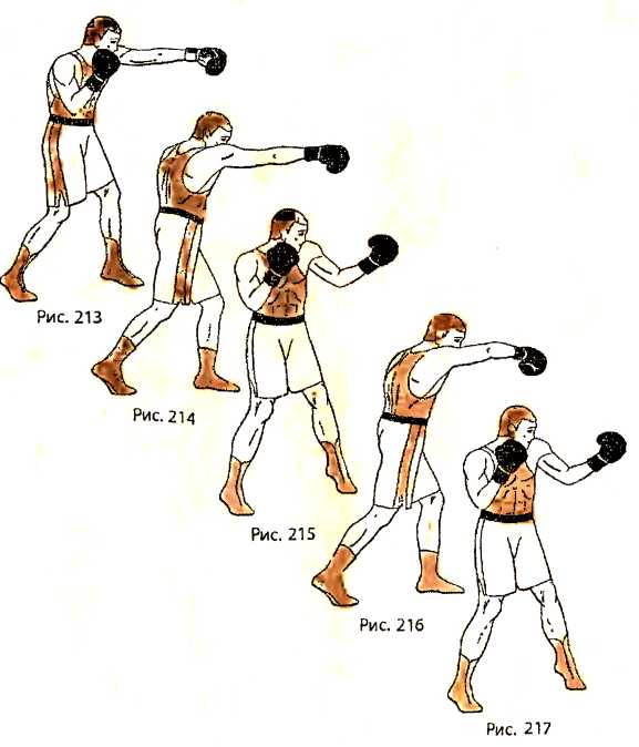 Выполняем прямой удар левой рукой в голову противника (рис. 213 - вид справа). Возвращаем левую руку и выполняем прямой удар правой рукой в голову противника, перенося вес тела на левую ногу (рис. 214 - вид справа). Возвращая правую руку, выполняем удар снизу левой рукой в голову противника, перенося вес тела на правую ногу (рис. 215 - вид справа). Возвращая левую руку, выполняем боковой удар правой рукой в голову, перенося вес тела на правую ногу (рис. 216 - вид справа), и, завершая атаку, выполняем удар снизу левой рукой в голову противника, перенося вес тела на правую ногу (рис. 217 - вид справа).