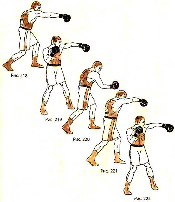 Выполняем прямой удар правой рукой в туловище противника, перенося вес тела на левую ногу (рис. 218 - вид справа). Возвращая правую руку, выполняем скачковый боковой удар левой рукой в голову противника, перенося вес тела на правую ногу (рис. 219 — вид справа). Возвращая левую руку, выполняем удар снизу правой рукой в туловище противника, перенося вес тела на левую ногу (рис. 220 - вид справа). Вернув правую руку и вес тела на правую ногу, выполняем этой же правой рукой боковой удар в голову противника, перенося вес тела на левую ногу (рис. 221 - вид справа). И, завершая атаку, выполняем боковой удар левой рукой в голову противника, перенося вес тела на правую ногу (рис. 222 - вид справа).
