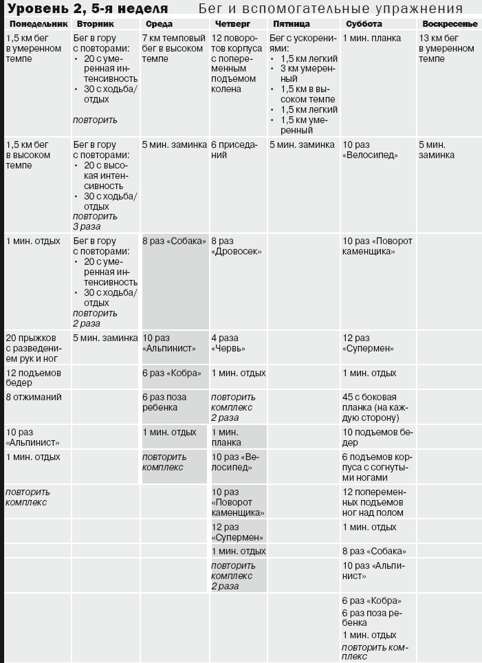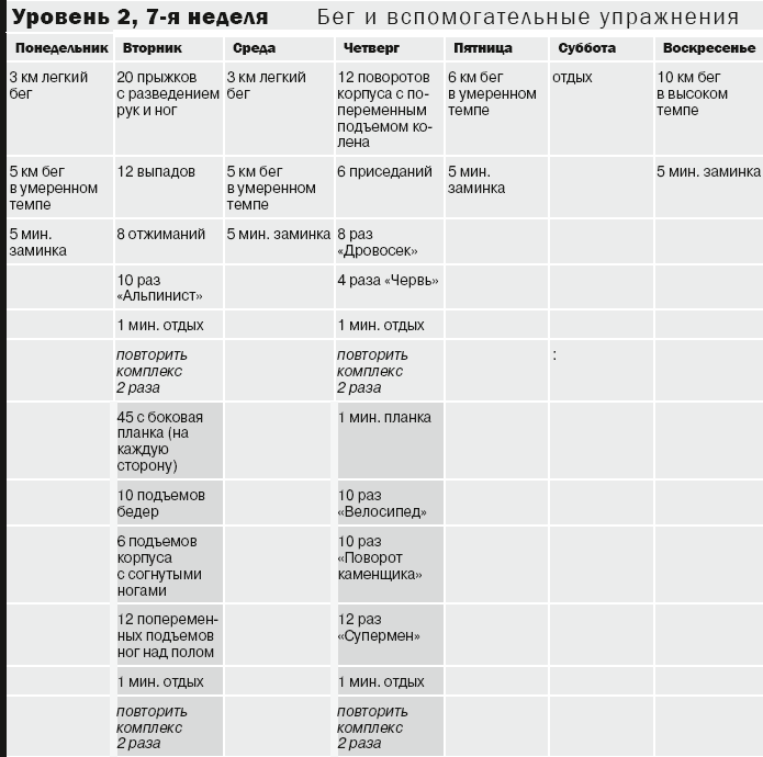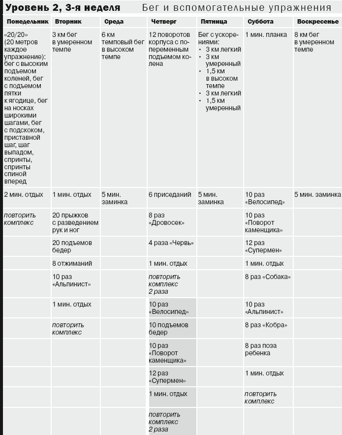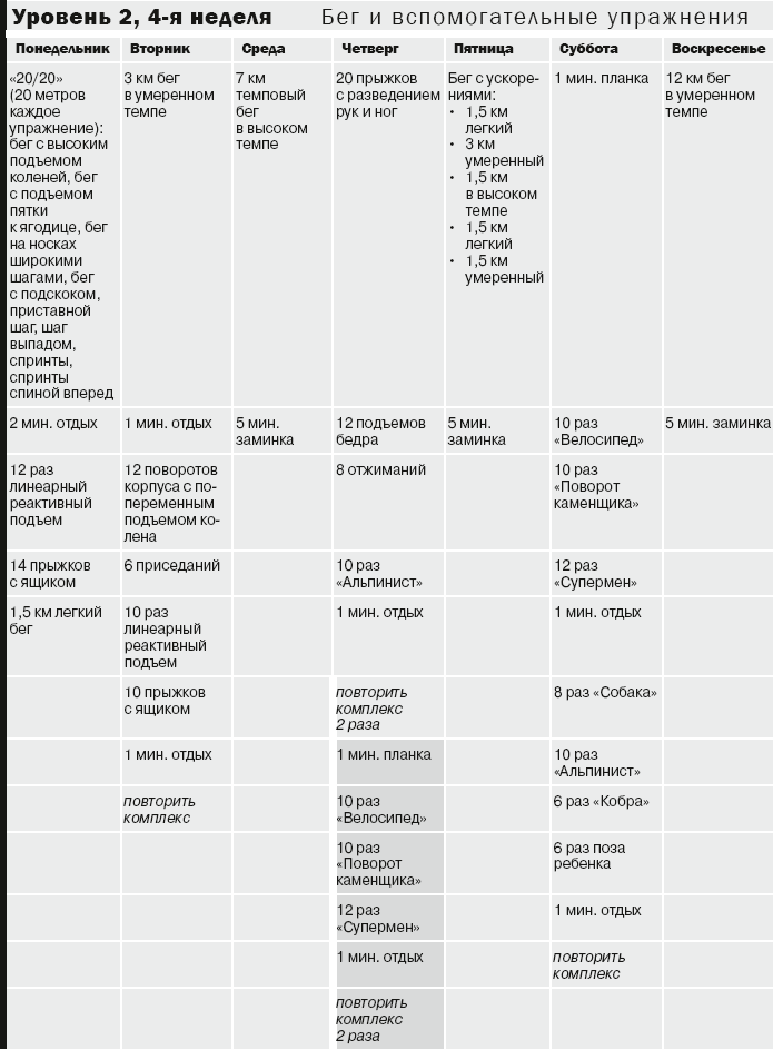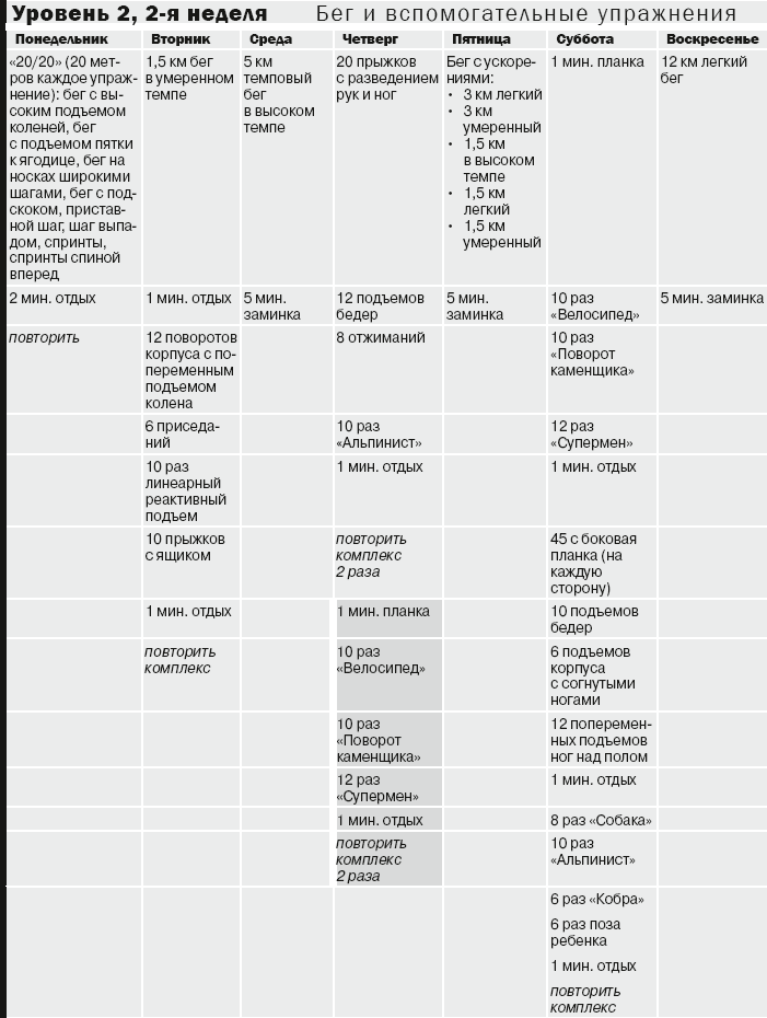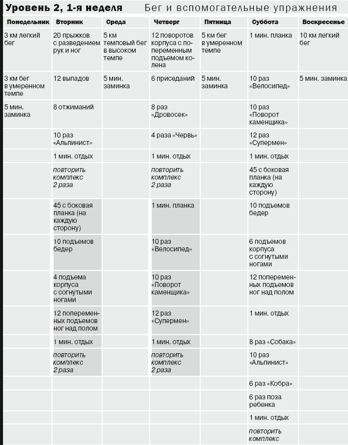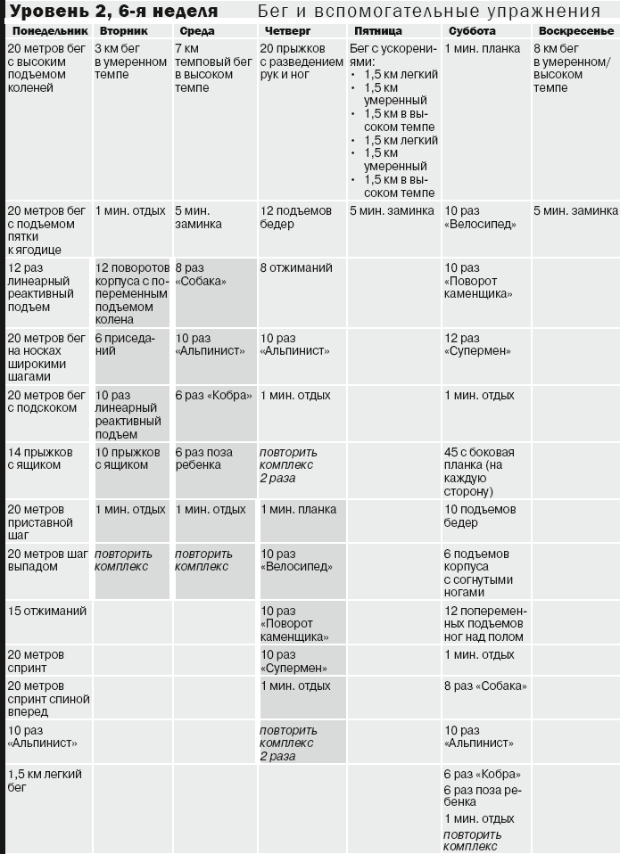 Примечание. Разомнитесь 5 минут перед интервальной тренировкой или вспомогательными упражнениями: растягивайтесь после каждой тренировки (интервалы кардиоупражнений, вспомогательные упражнения). На с. 169–174 вы найдете описания упражнений для разминки и растяжки. Используйте шкалу на с. 97 для определения уровней нагрузки (легкой, умеренной и высокой).