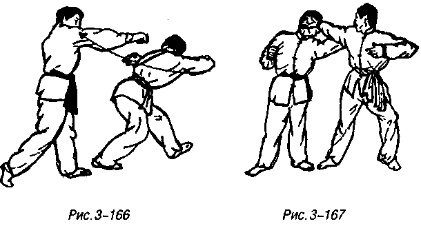 Движение не прекращается, корпус продолжает поворот вправо, тут же правая рука через переднюю зону идет вправо и назад, правая ладонь с тыльной стороной кисти в качестве точки приложения силы резко наносит швыряемый сваливающий удар по уху или правой стороне головы противника (рис. 3-167).