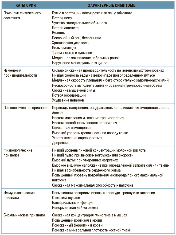 Существует множество симптомов перетренированности, однако они редко одинаковые у разных спортсменов. Именно поэтому трудно дать четкое определение этому состоянию. Единственные характерные для всех признаки, определяемые с точки зрения физиологии, – низкая производительность и сильная усталость – могут присутствовать, даже если атлет не перетренирован.