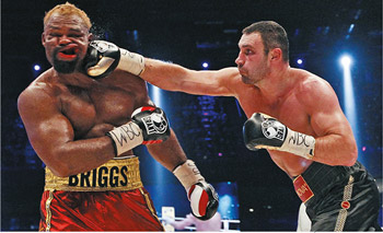 Правый прямой Виталия Кличко поражает Шеннона Бриггса
