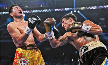 13. Кросс-каунтер. Относится к встречным ударам. Наносится правой рукой в подбородок при атаке противника прямым левой в голову. Своё название удар получил от перекрёстного направления правой рукой, идущей поверх вытянутой атакующей левой руки противника.