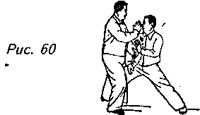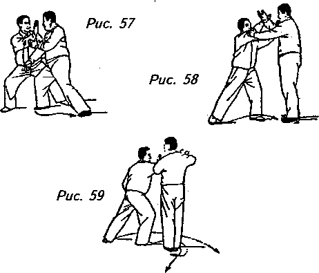 Поскольку ваш партнер делает “толчок” плечами, вашу правую ладонь вам следует разжать и выпрямленными пальцами, как когтями, сделать выпад ему в лицо. Это движение называется “царапающая ладонь” (рис. 57). Для уклонения от такого выпада ваш партнер вынужден поднять правую ладонь перед своим лицом, чтобы встретить ею вашу ладонь и удержать запястьем. В этот момент ему нужно ухватиться левой ладонью за ваш правый локоть, повернуться всем телом вправо, переместить свою правую ступню назад, поближе к внутренней стороне своей левой стопы, и, вместе с поворотом тела, перейти от позиции “стискивания” к позиции “откат назад” (рис. 58). Под воздействием его “отката назад” вы будете вынуждены перенести центр тяжести несколько вперед и сделать шаг вперед правой ступней, которую нужно будет расположить перед его ногами (рис. 59).