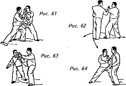 Если вы проводите “толчок” своего противника плечами, то в этом случае он вынужден применять левой рукой “царапающую ладонь”, протягивая ее к вашему лицу (рис. 61), а вы должны использовать свою левую ладонь, чтобы отвести его руку в сторону. В этот момент вам нужно будет повернуть корпус влево, чтобы начать “откат назад” (рис. 62). Отвечая на ваш прием, он должен шагнуть вперед правой ногой и протянуть свою левую руку к вашей груди (рис. 63, 64). После этого любой из вас может применить “царапающую ладонь", направляя ее в лицо противника, и получить в ответ “откат назад” левой рукой.