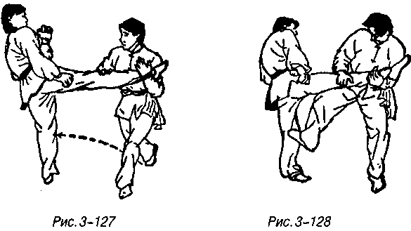 Из позиции для атаки швыряемой ладонью, когда противник правой ногой через правую сторону наносит влево хэнсаотуй по пояснице или ребрам, я следуя движению поворачиваюсь влево, одновременно ведя левую руку вниз, пронизываю влево под ногой противника и подхватываю ее, правой рукой с основанием ладони в качестве точки приложения силы выполняю толчковое блокирование ноги противника, отбивая атаку (рис. 3-127).