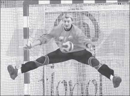 Рис. 38. Вратарь в прыжке загораживает ворота и принимает мяч на туловище